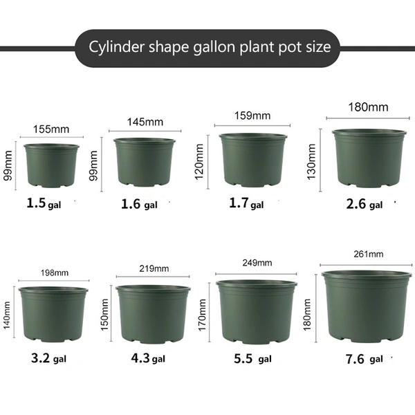 Our gallon plant pots has features of controlling main roots and growing more fine roots,it is benefit to potted plants growing,improve the survival rate of the plants. our gallon nursery pots have volume selection of 1.5 gallon、1.7 gallon、2.6 gallon、3.2 gallon、4.3 gallon、5.5 gallon、7.6 gallon、13.8 gallon.